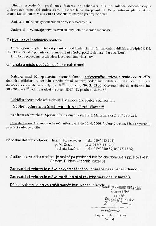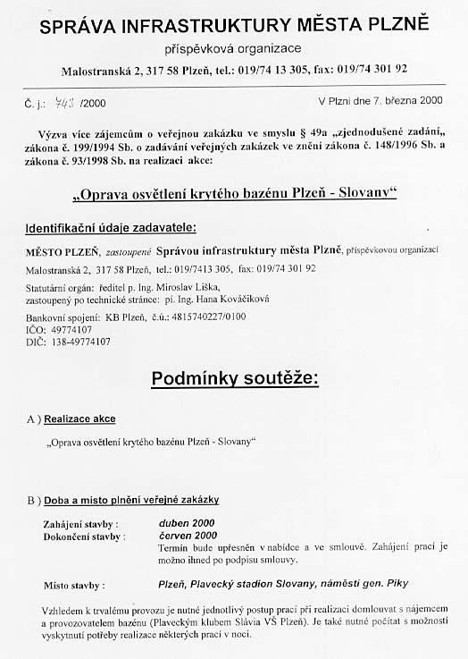 | Předmět zakázky | Oprava osvětlení krytého bazénu v Plzni na Slovanech |