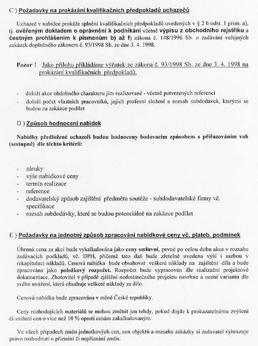 | Hodnotící kritéria | 1. záruka 2. cena 3. termín 4. reference 5. dodavatelský způsob 6. rozsah subdodávky |