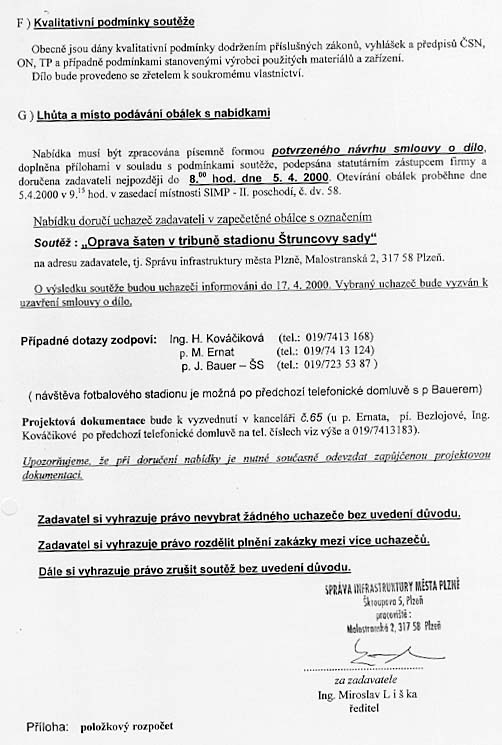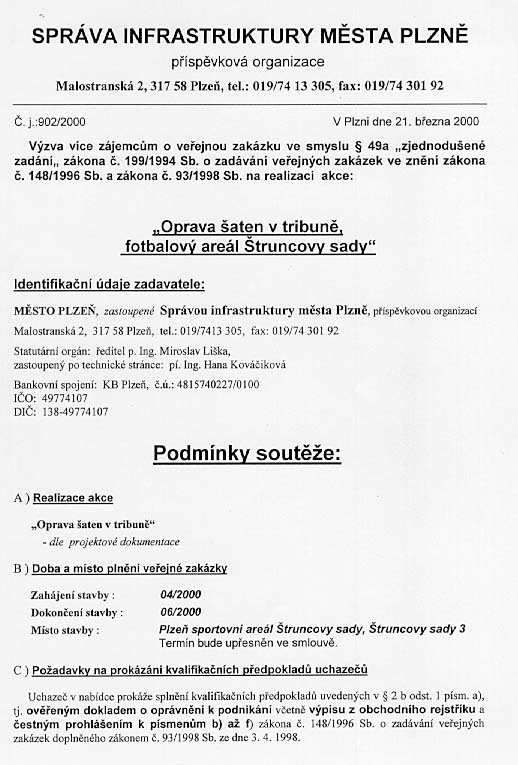 | Předmět zakázky | Oprava šaten v tribuně stadionu Štruncovy sady |