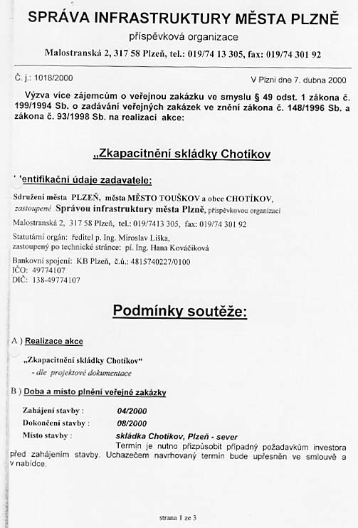 | Předmět zakázky | Zkapacitnění skládky Chotíkov |