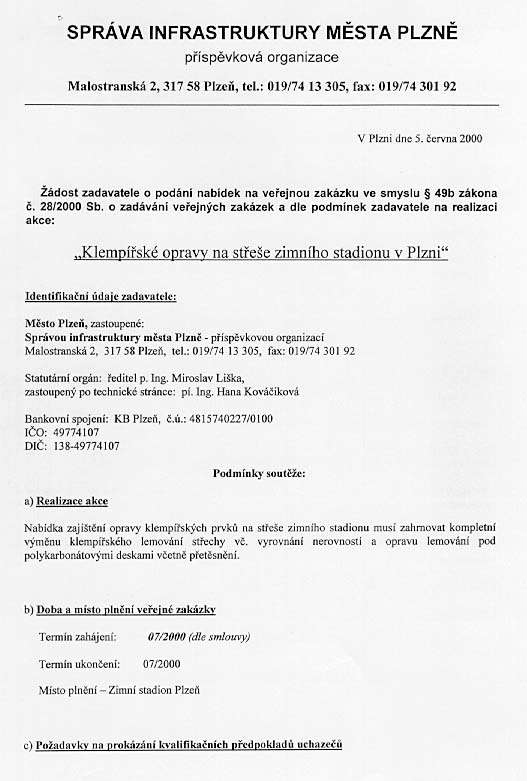 | Předmět zakázky | Klempířské opravy na střeše zimního stadionu |