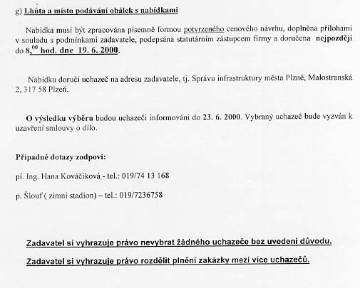 | Nabídka: 1. 237 447 Kč 2. záruka 3. 14.7.2000 4. dle referenčních listů 5. dle předložených podkladů |