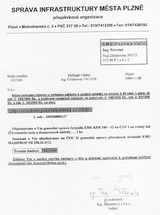 | Předmět zakázky | Oprava technologické části ČOV I. a II. ČOV I - gen.oprava čerpadla EMU KPR 340-12 na vratný kal - 1 ks |