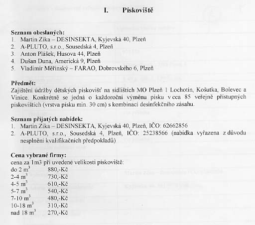 | Předmět zakázky | Zajištění údržby dětských pískovišť na sídlištích MO Plzeň 1 Lochotín, Košutka, Bolevec a Vinice. (Každoroční výměna písku v cca 85 veřejně přístupných pískovištích-vrstva písku min. 30 cm, s kombinací desinfekčního zásahu |
