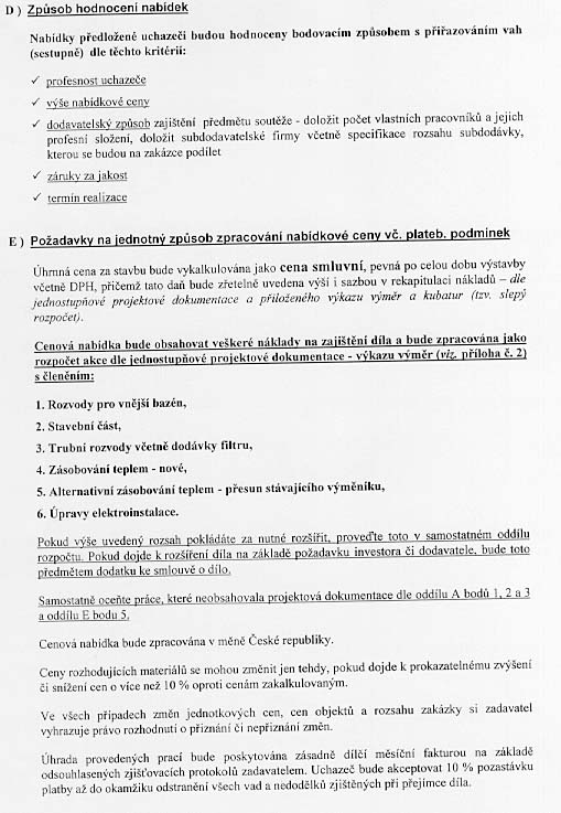 | Hodnotící kritéria | 1. profesnost 2. cena 3. dodavatelský způsob 4. záruka 5. termín |