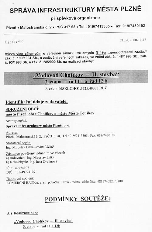 | Předmět zakázky | Vodovod Chotíkov - II.stavba 3. etapa - řad 11 a řad 12b Výstavba vodovodních řadů |