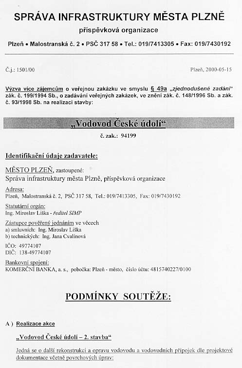 | Předmět zakázky | Vodovod České údolí - další rekonstrukce a oprava vodovodu a přípojek včetně povrchových úprav |