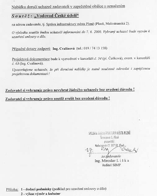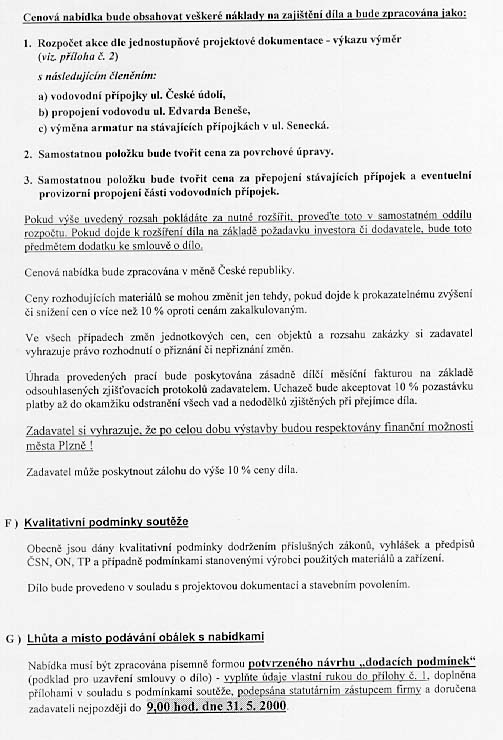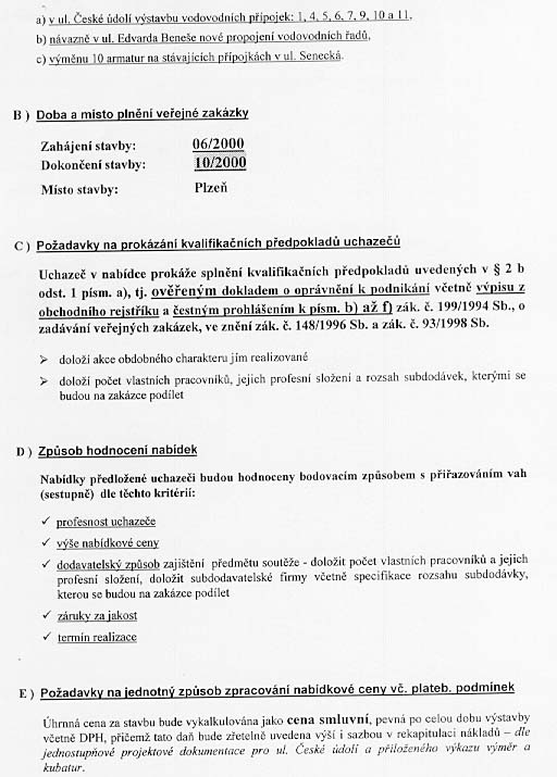 | Nabídka: 1. dle referenčních listů 2. 1 162 182 Kč 3. subdodavatelé 4. 60 měsíců 5. 10/2000 |
