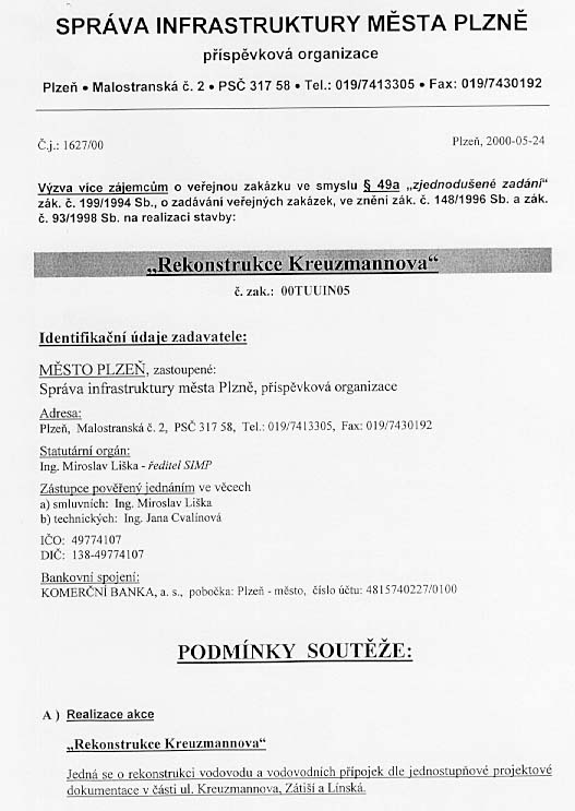 | Předmět zakázky | Rekonstrukce Kreuzmannova - rekonstrukce vodovodu a přípojek |
