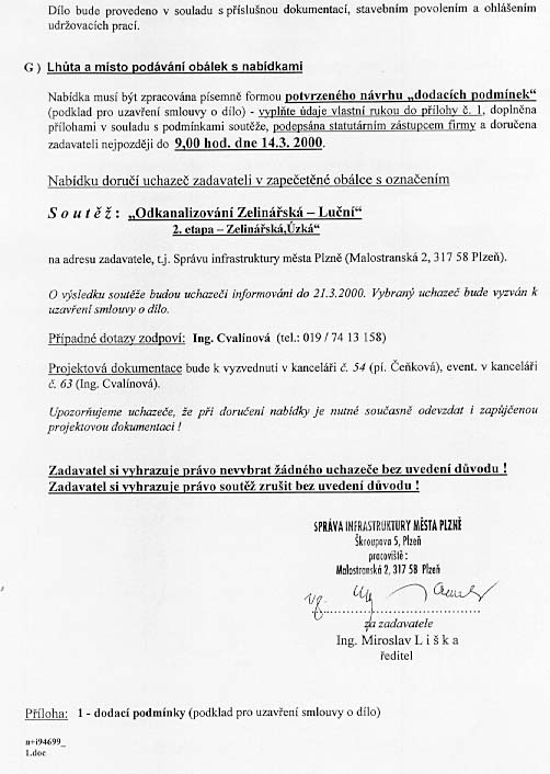 | Nabídka: 1. 2 505 934,30 Kč 2. dle referenčních listů 3. vlastní 4. 60 měsíců 5. 06/2000 |