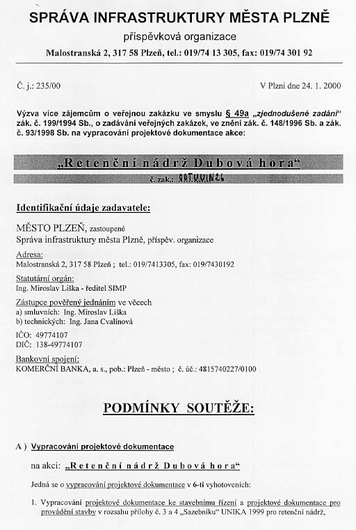| Předmět zakázky | Retenční nádrž Dubová hora - vypracování projektové dokumentace |