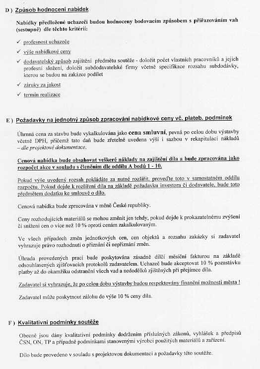 | Hodnotící kritéria | 1. profesnost 2. cena 3. dodavatelský způsob 4. záruka 5. termín |